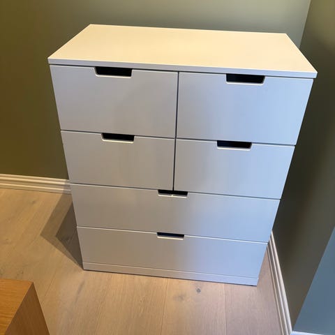 En veldig pent brukt malm kommode i eik. Kommoden har en ødelagt planke mellom skuff en og to, likevel fungerer skuffene fint. Skaden synes ikke grunnet at jeg har limt og skrudd den tilbake igjen, altså skaden er reparert. Alle skuffer virker og kommoden er hel og stødig ellers. Håper å selge så fort som mulig.