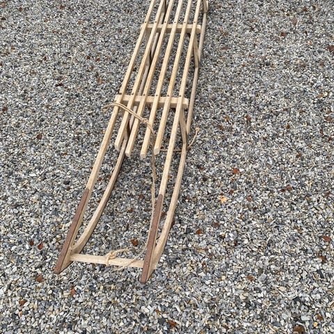 Sparkstøtting i tre og metall. Tradisjonelt norsk kjøretøy for vinterbruk, med sete og håndtak i tre, og metallskinner for glid på snø og is.