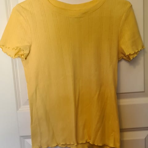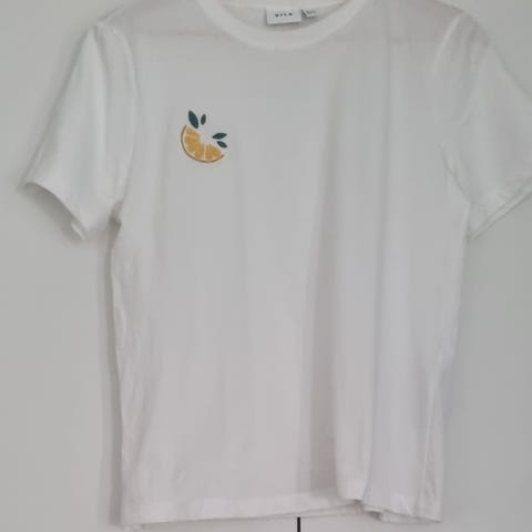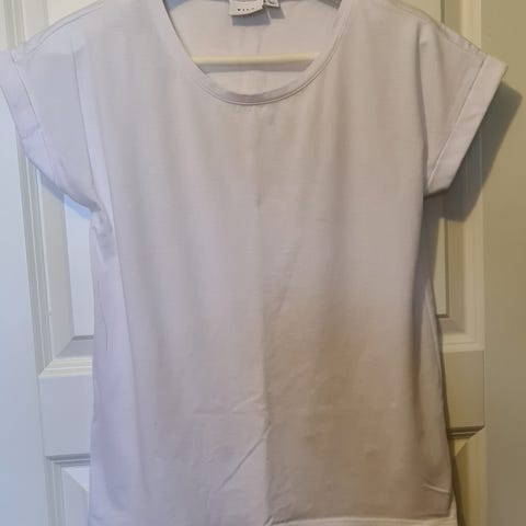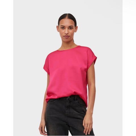 Vila T-skjorte i størrelse S for kvinner. T-skjorten er rosa og laget av 50% resirkulert polyester, 24% polyester, 23% viskose og 3% elastane. Den har korte ermer med en lett puffeffekt og en rund hals.