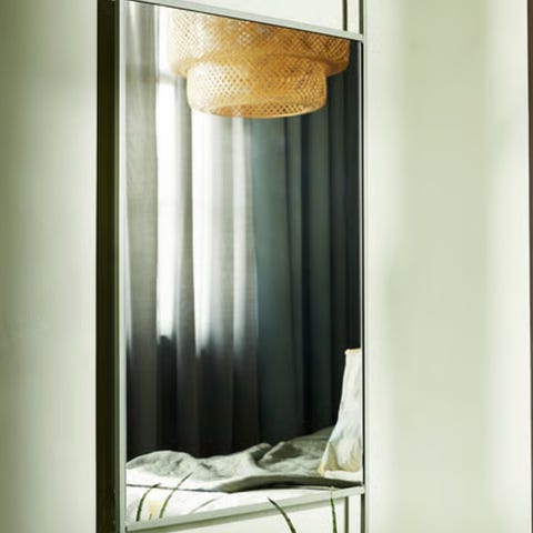 IKEA speil med oppbevaring i hvit farge. Speilet har en ramme i metall og inkluderer kroker for oppheng av små gjenstander. Passer til bruk i gang, soverom eller andre rom hvor både speil og oppbevaring er ønskelig.