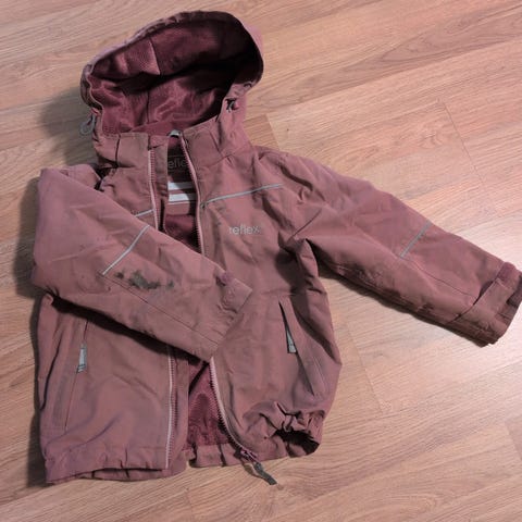 Vinterdress fra Reflex I størrelse 104 gis bort. Godt brukt. Har lappet et hull på foten, men det må gjøres på nytt før videre bruk. Mangler fotstrikk.