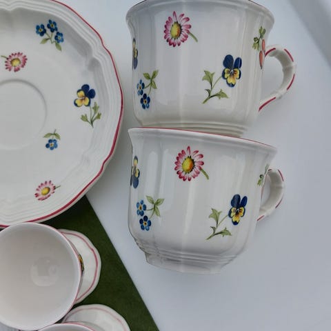 Fire «Petite fleur» kaffekopper selges samlet. Kopper med tilhørende skåler, dekorert med små blomster i flere farger. Laget av vitroporselen.