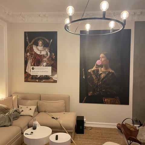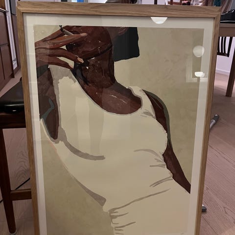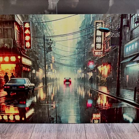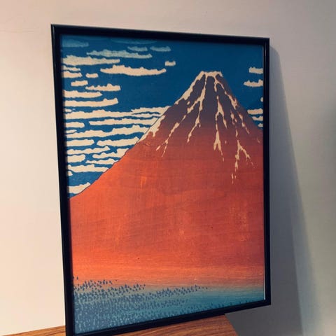 Massiv utgave av The Great Wave av Hokusai. 100 x 140 cm. I generelt god stand, men ser noe merker på den. Kan sikkert ha godt av en vask eller stramming. Duk spent over aluminiumsramme. Kan også spennes om så rammen blir synlig om man ønsker, som i siste bilde.