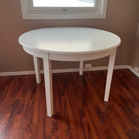 Selger lite rundt bord med 3 stoler som passer perfekt på kjøkkenet eller i en hybel hvor man ikke har plass til all verden. Bordet er helt men trenger nok et lite malingsstrøk. Stolene er litt dratt ut tråer av grunnet katt i hus. Men ellers fint