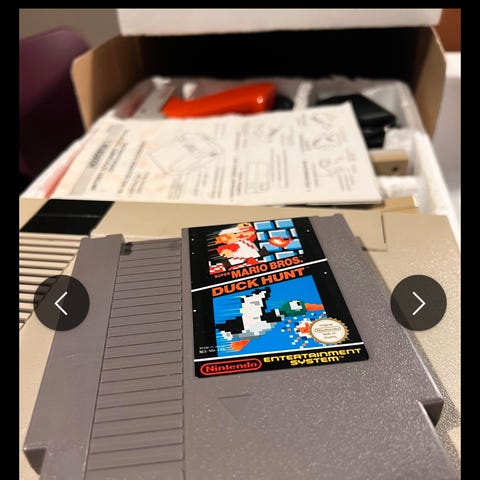 Velfungerende Nintendo Entertainment System NES Action Set med konsoll, 2 kontroller, strømforsyning og spillkassetter inkludert. Settet inneholder klassiske spill som Super Mario, Duck Hunt, Chip*n Dale og Super Mario Bros 3. Produktet leveres i original eske med beskrivelser.