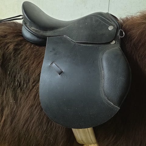 Sal i lær med tilhørende stigbøyler og lærgjorde. Salen har brun farge og viser tegn til bruk. Mål er forsøkt vist på bilder. Salen er brukt på liten kalblodshoppe. Passe til stor ponni/ liten hest. Selges da jeg ikke har hesten lenger.