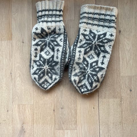 Hjemmestrikkede votter, pent brukt. Vasket, hele og pene. Størrelse dame. Farge lilla og offwhite