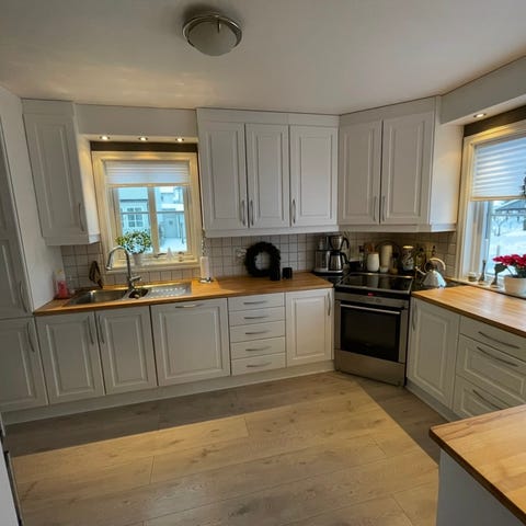 Komfyr med induksjon platetopp fra gorenje og kjøleskapets electrolux kan følge med for 1000kr ekstra per stk eller samlet for 1500kr (Mikrobølgeovn, oppvaskmaskin, kaffetrakter og vannkoker følger ikke med).