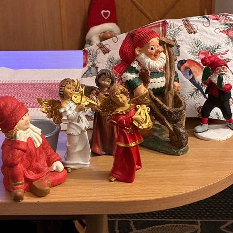 Noe nytt (bordløper, juletrepynt) og noe brukt (figurer og dukker).