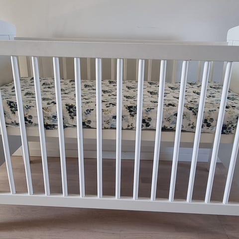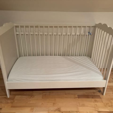 Sprinkelseng med madrass i god stand selges pga ikke behov for den lengre. Pent brukt til to barn som bedsidecrib før de flyttet inn på egne rom i andre senger. Sengen har noen små merker og bruksbetingede skader på treverket, men ingen skader eller defekter. Brukt mer til oppbevaring enn at barn har sovet i den😅 Madrass følger med. Fra røyk-og dyrefritt hjem. Selges ikke. Selges som den er nå, men kan demonteres hvis ønskelig.