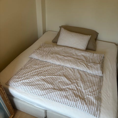 Selger en brukt Jensen seng. Den er lysere i fargen. Følger med sorte ben (demonterte de før jeg tok bilde). Rammen av sengen kan splittes i to så det blir to enkelt senger. Følger også med overmadrass og madrassbeskytter.