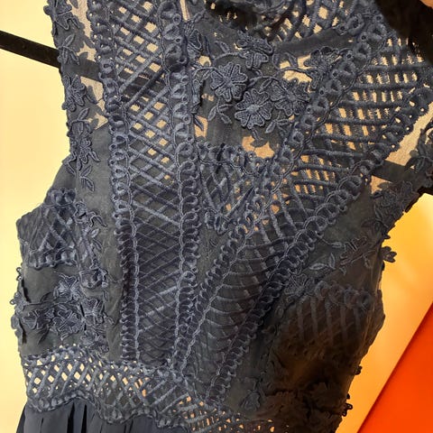 Figurnær modell med rynkedetaljer og dekorative stropper. Glidelås bak. Pent brukt og i god stand. Passer perfekt til fest, selskap eller kveld ute.