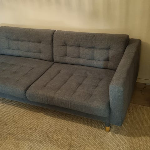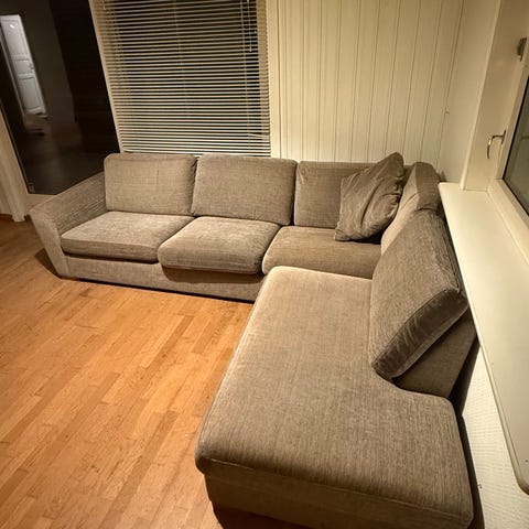Sofa er i daglig bruk i kjellerstua. Den er brukt men har fortsatt komfort å gi. Vi skal gå over til recliner.