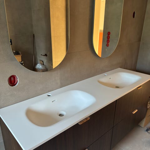 Benkeplaten er klargjort for underliming av en vask av type Duravit D-Code, som du får kjøpt på @vvskupp.no til kr. 1190,-. Det er denne vasken vi har brukt også, se detaljer på bildene vedlagt.