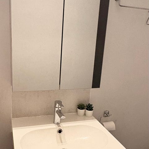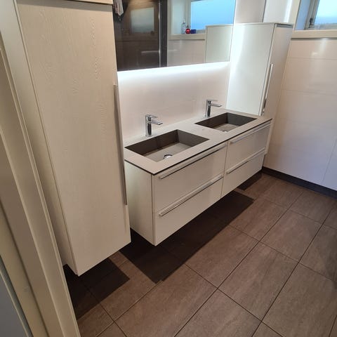 Har prøvd å legge med detaljer på bildene. Her ser dere benkeplaten på badet vi renoverte, og vasken underlimt på den nye benkeplaten vi fikk. Det er helt nydelig. Spør meg om noe er uklart. Platen kan hentes snarest.