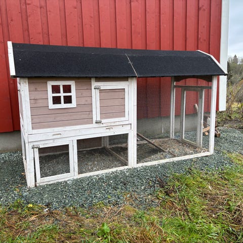 Vi måtte bygge større hønehuset da flokken vokste så nå har vi ett av typen Kaklebu som ikke brukes lenger. Må hentes