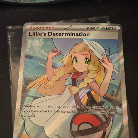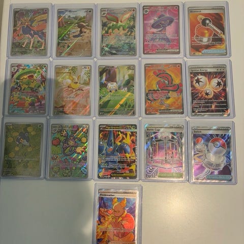 Pakke med diverse Pokémon samlekort, inkludert flere kort i beskyttelseslommer.
