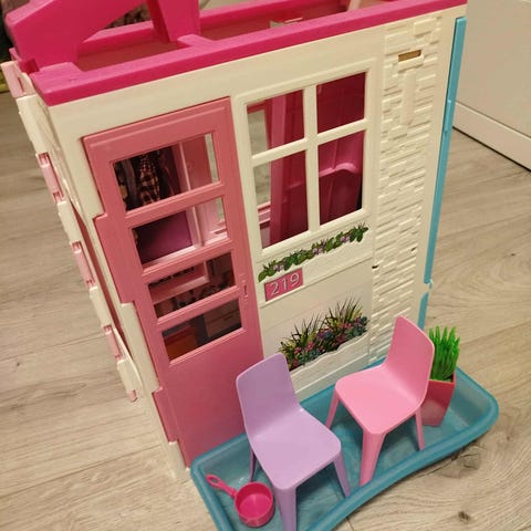 Barbie dukkehus i rosa og hvit med flere rom og møbler inkludert. 3 deler. 90 cm høyt og 85 cm bredt når det står samlet.