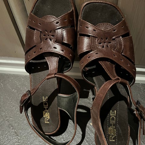 Damesandaler str 40 til salgs. Pent brukt. Ingen synlige skader, men det er en flekk på den ene sålen fra en klistrelapp som ikke lar seg helt fjerne.