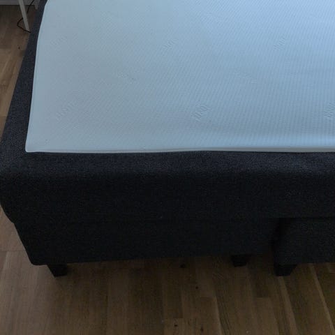 IKEA Kontinental seng med to separate madrasser og mørk ramme. Sengen har ben av lyst tre (20 cm) og hvite madrassoverflater. Passer for to personer.