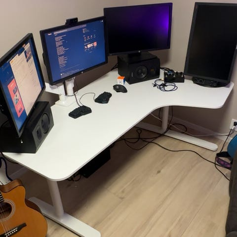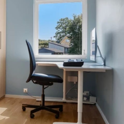 Dette hjørneskrivebordet fra Ikeas Bekant-serie tilbyr en funksjonell arbeidsflate med en bredde på 160 cm og varierende dybder fra 69 cm til 110 cm. Bordets høyde kan justeres mellom 72 cm og 85 cm, noe som gir ergonomisk fleksibilitet for en komfortabel arbeidsdag.