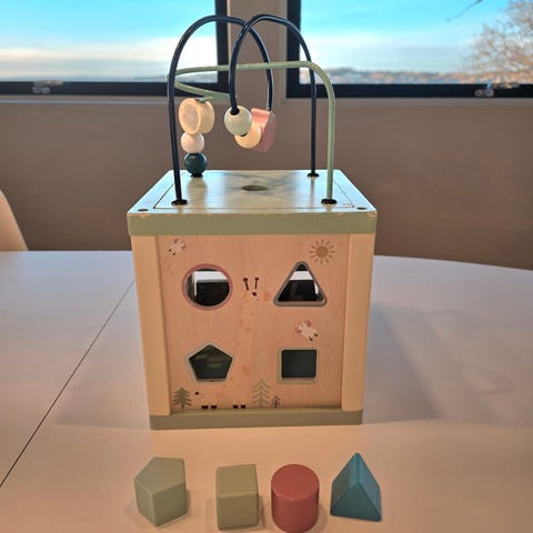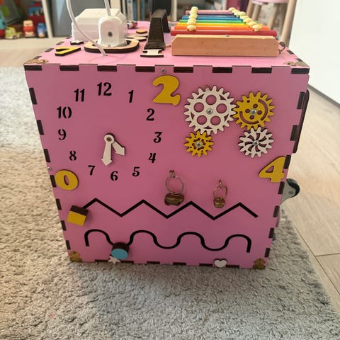 Aktivitetsleke for barn med flere sider utstyrt med tannhjul, alfabet læring og telleverktøy. Laget av tre og fargerike detaljer, designet for å stimulere barns motoriske ferdigheter og læring.