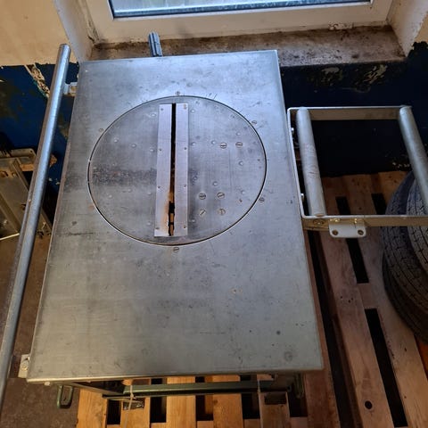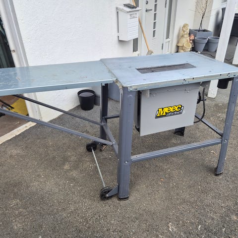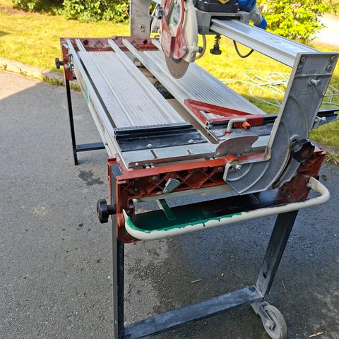 Byggsag 1603 med metallramme og elektrisk motor. Sagblad med beskyttelsesdeksel og justerbar vinkelinnstilling. Egnet for presisjonskutting av tre og andre materialer. Inkluderer støtteben for stabilitet under bruk.