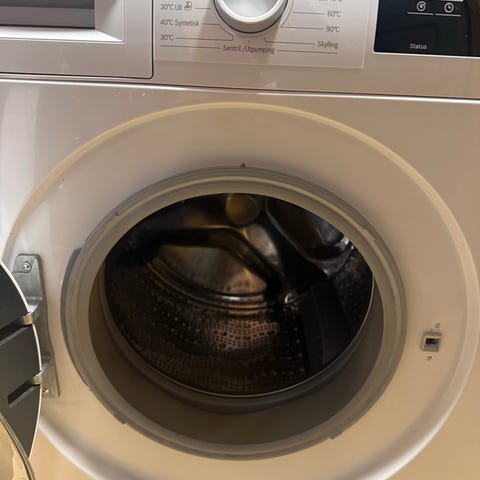 Bosch kondens tørketrommel med frontåpning og roterende kontrollknapp for ulike tørkeprogrammer. Egnet for tørking av forskjellige tekstiltyper inkludert bomull, syntetisk, ull og blandede stoffer.