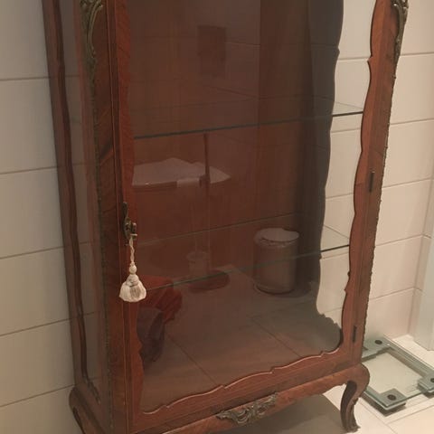 Antikk skrivebord /skap/sekretær laget i tre med flere skuffer og utfellbar skriveflate. Møbelet har dekorative detaljer og en klassisk design.