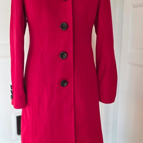 Kåpe i ull fra Oleana i nydelig rødfarge. Sjalkrage, lukking med knapp og splitt bak. 50% alpakkaull og 50% ull.