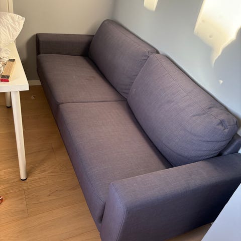 Jeg цgir bort en sofa på grunn av hyppig flytting. Jeg kjøpte den for 2 år siden, den er i god stand. Det var en katt i huset, derfor er det små merker fra katten og et par flekker på sofaen.