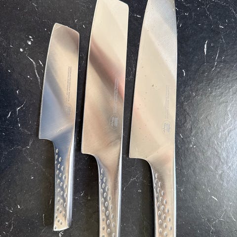 Global knivsett bestående av 3 kniver i rustfritt stål. Knivene har ergonomiske håndtak med hullmønster for bedre grep. Settet inkluderer kniver egnet for ulike kjøkkenoppgaver.