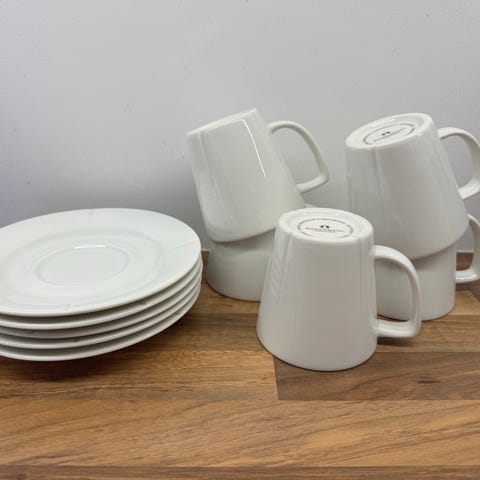 Rosendahl Grand Cru kopp i hvit porselen. Fire kopper med hank, egnet for servering av varme drikker. Designet for å passe i moderne kjøkkenmiljøer.