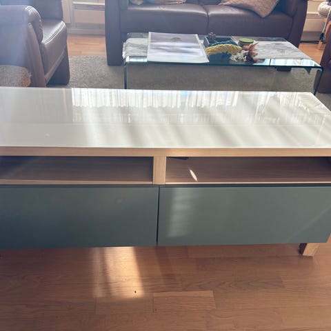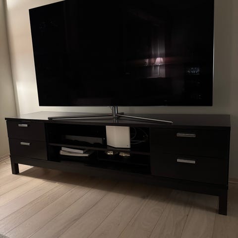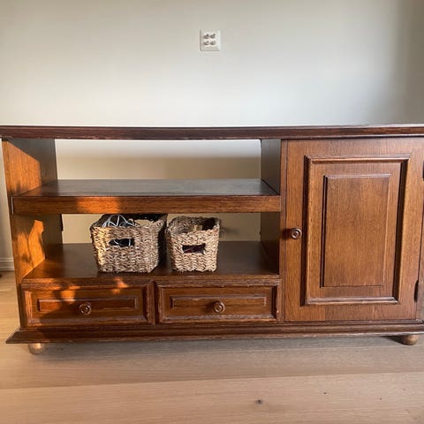 Selger en solid og pen TV-benk i tre, pent brukt og i god stand. Tidløst og robust design som passer godt i de fleste stuer. Praktisk løsning med skap, skuff og åpen hylle for dekoder, spillkonsoll eller annet utstyr.