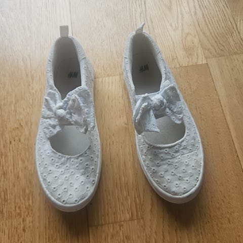 H&M barnesko for jente i størrelse 30. Skoene er svarte med en dekorativ sløyfe og har en glatt såle. Egnet for barn og laget i materialer som gir en blank finish.