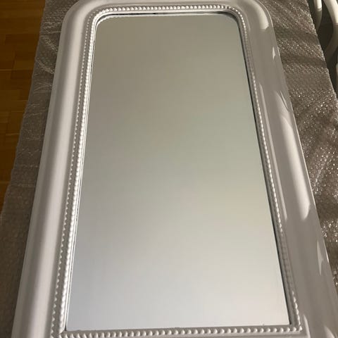Speilets mål er høyde 97 cm, bredde 76 cm. Svart dekorativ ramme. Selve speilet er helt, ingen sprekker eller flekker. Må hentes.