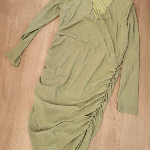 Bik Bok festkjole i størrelse XL, farge gull, laget av polyester. Kjolen har en glitrende overflate og er perfekt til nyttårsfesten.