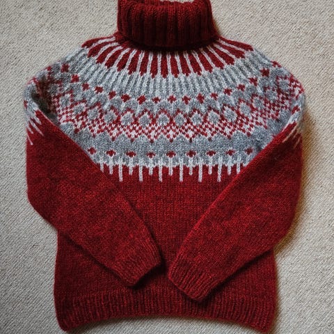 Hjemmestrikket hals fra petiteknit. Pent brukt og ingen skader, men vil si det er noen bruksmerker her og der 🌸
