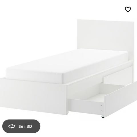 IKEA sengeramme med integrerte oppbevaringsskuffer under sengen. Rammen er hvit og laget av tremateriale. Passer for enkeltseng eller mindre madrassstørrelse.