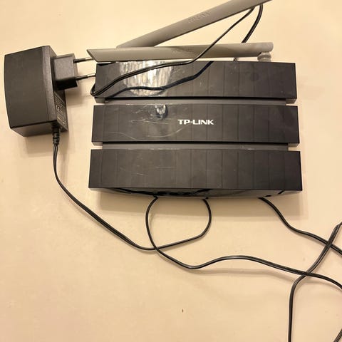 Tenda AC1200 Router med kablede tilkoblinger og strømforsyning. Enheten har et kompakt design med flere porter for nettverkstilkobling. Passer for bruk i hjem eller små kontorer. Brukes til å forlenge og forsterke det trådløse signalet til utstyret du tilkobler nett.