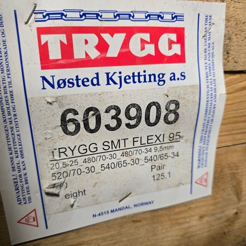 Ett sett med nye Trygg SMT Flexi kjettinger selges. Kjettingene er ikke tatt ut av kasse. Ikke åpnet så dem er nye. Har kvittering på dem.