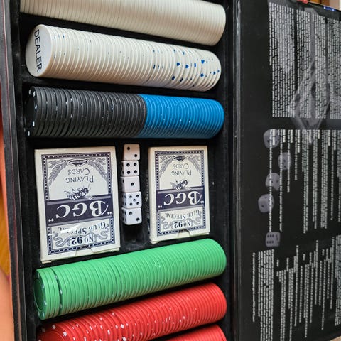 Poker sett i aluminium koffert med forskjellige fargede pokerbrikker, kortstokk og terninger. Kofferten har låsbare klaffer og bærehåndtak for enkel transport og oppbevaring.