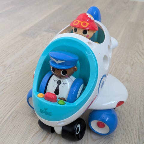 Pent og lite brukt lekefly med lyd og lys, og som kan kjøre av seg selv, eller kjøres ved bruk av fjernkontroll. Nypris 649.