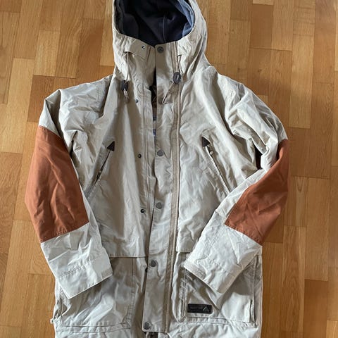 Nitro Snowboards snowboardjakke og bukser i størrelse medium. Jakken har burgunder farge med detaljer, og buksene er beige. Egnet for snøbrettkjøring og vinteraktiviteter.