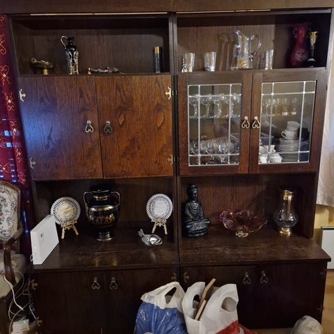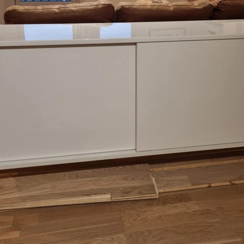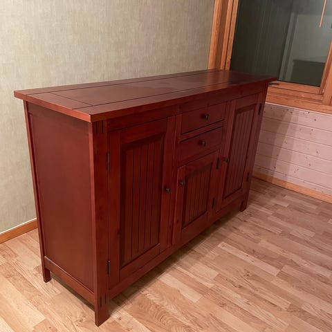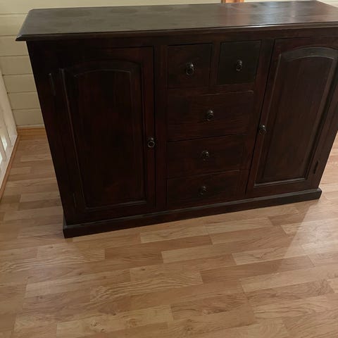 Lang skjenk brunbeiset m flere skuffer og 2 dobble skap. Gis bort pga flytting. Må hentes asap.