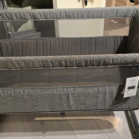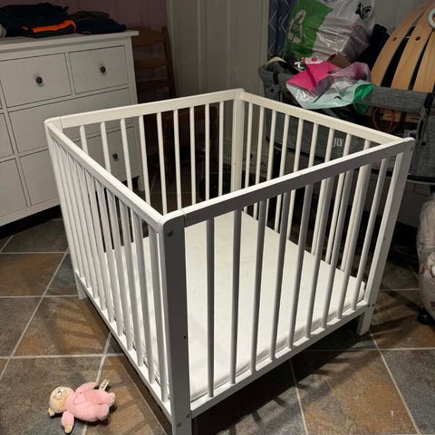 Gammel uttrekkbar barneseng, fra 1960 eller tidligere. Seng som vokser med barnet. Malt i en svak grønnfarge som ikke kommer helt frem på bildene.