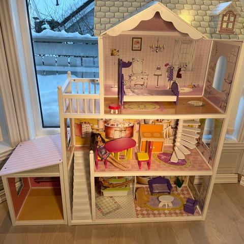 Lundby dukkehus med flere rom og møbler inkludert. Dukkehuset har tre etasjer med detaljerte interiører som sofa, spisebord, piano, og trapper. Materiale i tre.