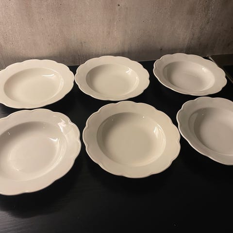11 stk Alfred Meakin suppetallerken i porselen med dekorativt mønster rundt kanten.