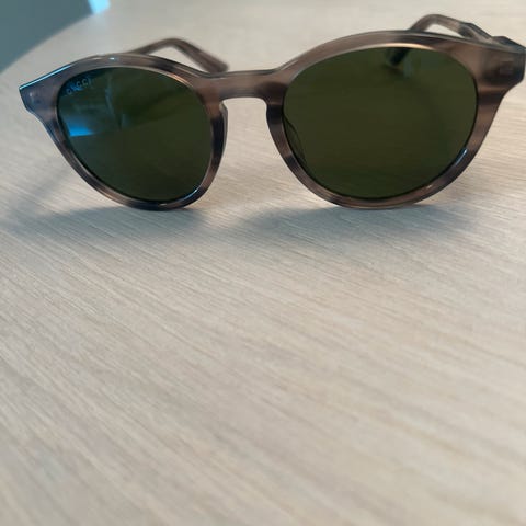 Brillene har en bred innfatning med mørke glass, og den klassiske Gucci logoen på siden.