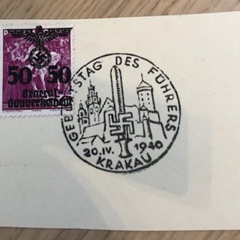 Poste Italiane frimerke med motiv avHitler og Mussolini. Fargen er lilla. Stemplet og brukt.